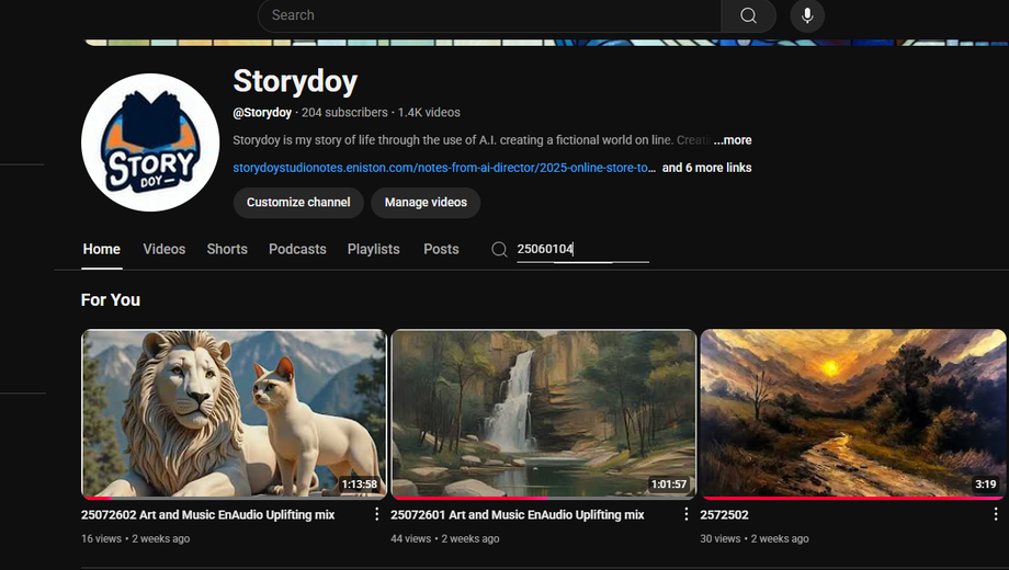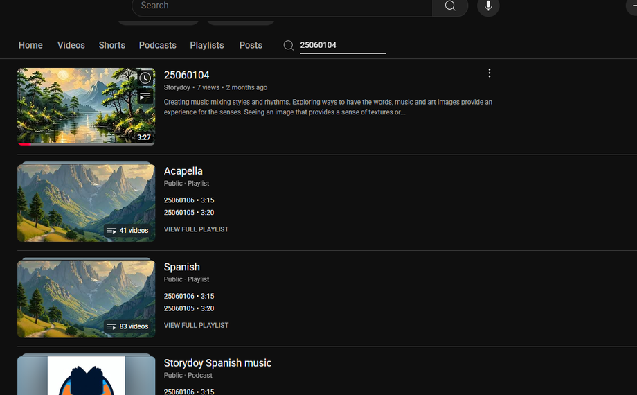 I wanted to listen to this song again 25060104. I am aware it is in various playlist and over time it has been remixed with different audio. First I used the channel search on Storydoy to see the options available today.